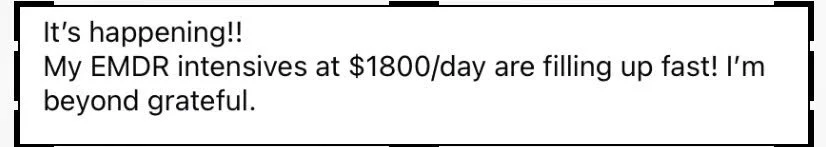 No way! Intensives are effective for many different types of therapy including IFS, Couples - EFT, Brainspotting, psychodynamic, ERP, CBT, DBT, and many more. Which is why the marketing strategies I teach inside this program apply to any therapy intensive. And with personalized feedback, we can tailor your messaging specifically to your perfect-fit client.