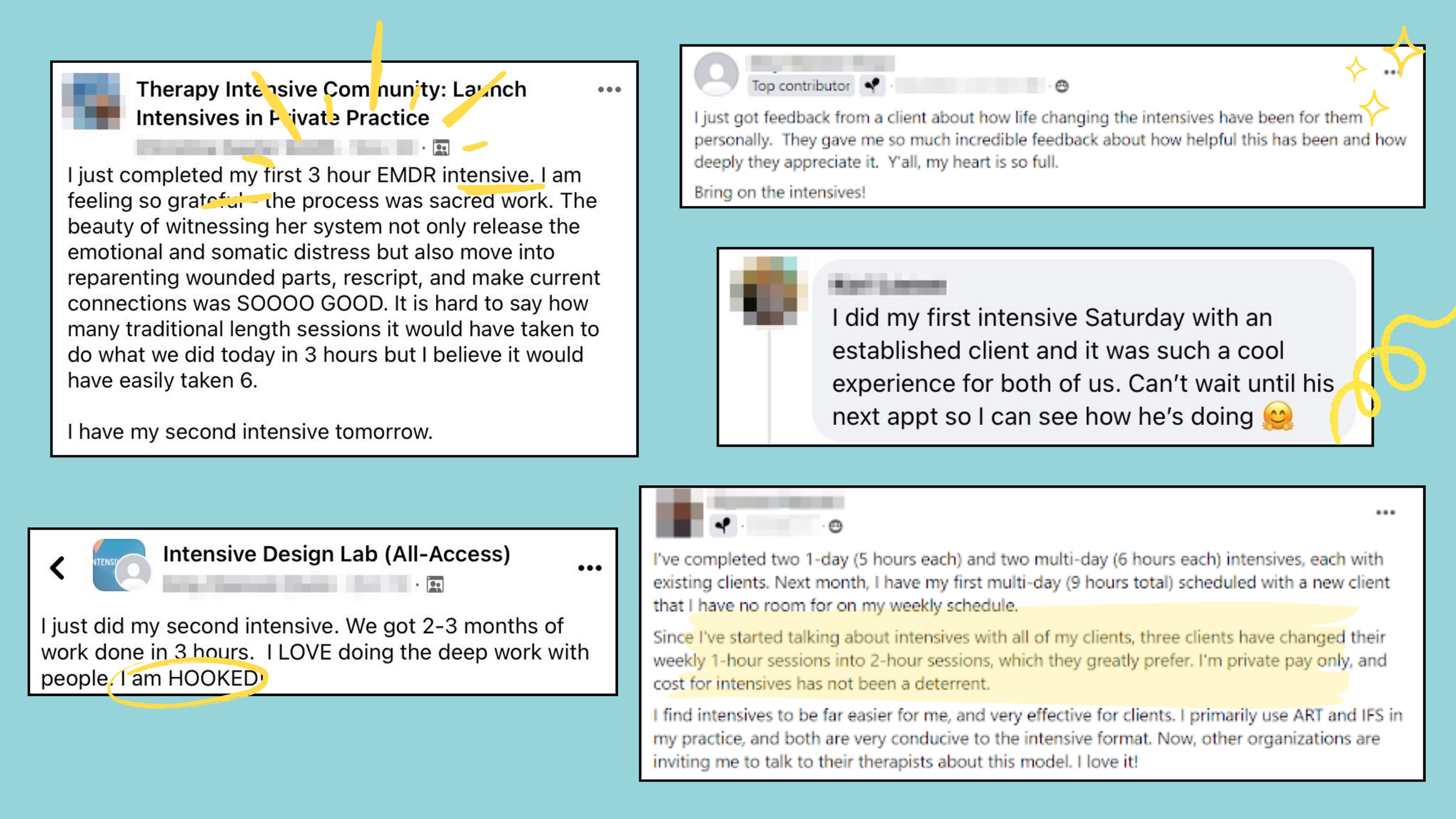 Let me tell you a secret. Somewhere we got the idea that only therapists with 20+ years of experience can do intensives. That is completely wrong! If you can offer therapy in an hour, you can offer it in 3 hours. Of course, there is an art & science to it (which I’m going to share with you) but do not think for a second that you’re not able to do this because you lack clinical experience. I’m telling you - insurance companies created the 57-minute session arbitrarily!!! model. Intensives gives us a way to offer therapy in a way that works best for our clients and for ourselves. It's time to start offering sessions in a way that is built around clinical need, not session reimbursement.