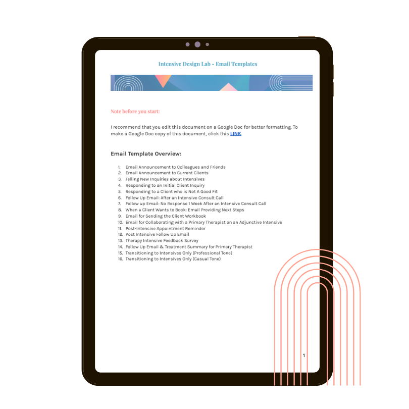 Take the guesswork out of communication with this collection of ready-to-use email templates for every stage of your therapy intensives. Whether responding to client inquiries, sending session reminders, or building referral relationships, these templates make communication clear, professional, and stress-free. Save time while confidently connecting with clients and colleagues. $350 Value