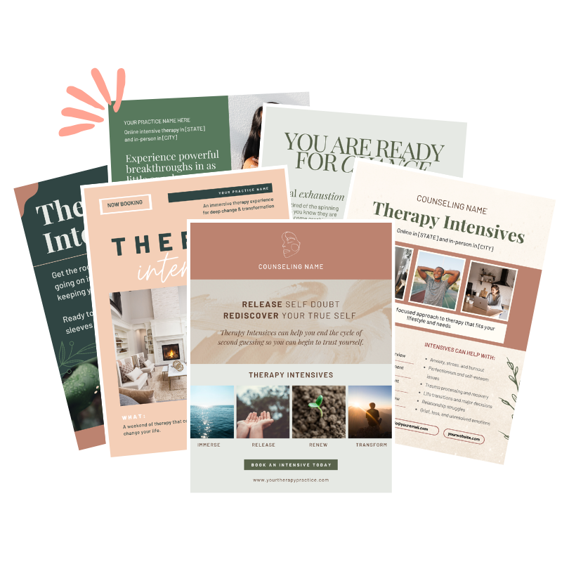 Easily promote your intensives with this collection of customizable Canva flyer templates, designed to connect with ideal clients and highlight the value of your services. Plus, a bonus referral letter template helps you build partnerships with providers and expand your reach. $85 Value