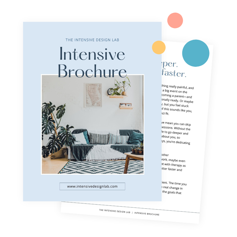 Introduce your therapy intensives with this beautifully designed, customizable e-book brochure. Featuring a welcome letter, sample schedules, FAQs, and package overviews, this resource sets the stage for a premium experience and gives clients the clarity they need to invest in your services. $250 Value